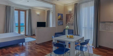 We offer various accommodation options including standard one-room apartments with all the necessary comforts, one-room apartments with a sea view where you can lose yourself in the beautiful sunsets, junior suite apartments that are also perfect for 4 people with additional facilities, and junior suite apartments with an exclusive terrace where you can admire the beautiful panoramic sea view.
